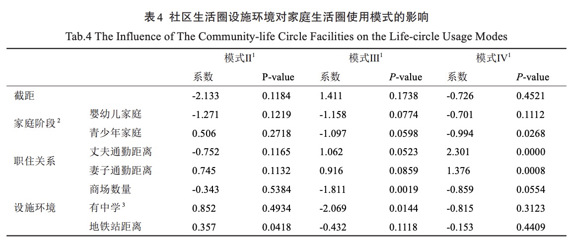4. 下图是一篇论文中的回归模型结果。 该论文(知网链接) 把家庭生活圈划分成了4种模式,进而分析社区环境对这些模式的影响。