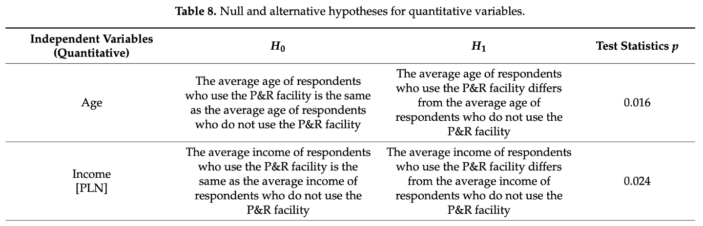 3. 下图是一篇论文中的T检验结果。 该论文(全文链接) 探讨了居民的个体属性与是否使用P&R(Park and Ride,停车换乘)交通设施的关系。